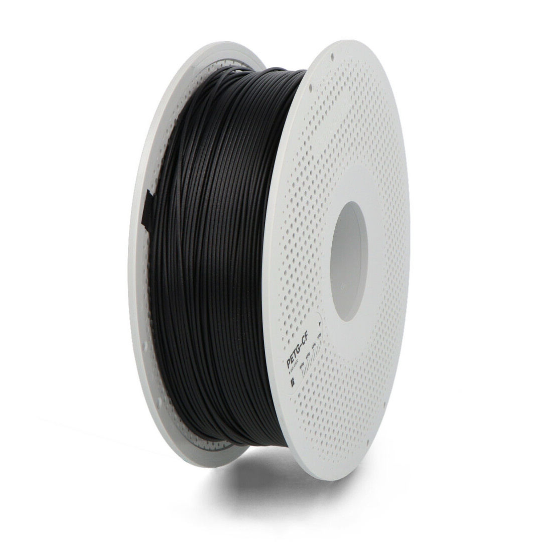 - Wzmocnienie włóknem węglowym: Filament PETG-CF jest kompozytem PETG z dodatkiem włókna węglowego, co zwiększa jego wytrzymałość przy zachowaniu dobrej elastyczności i błyszczącego wyglądu.
