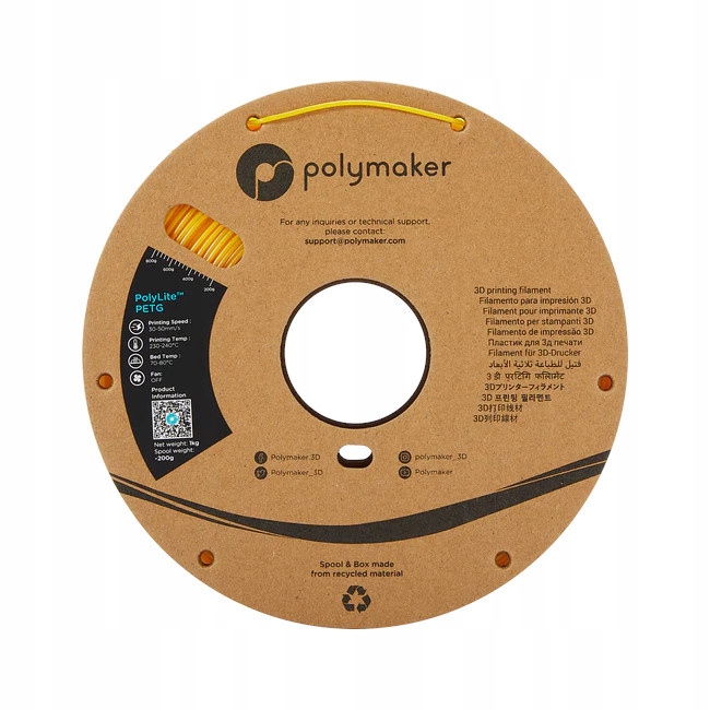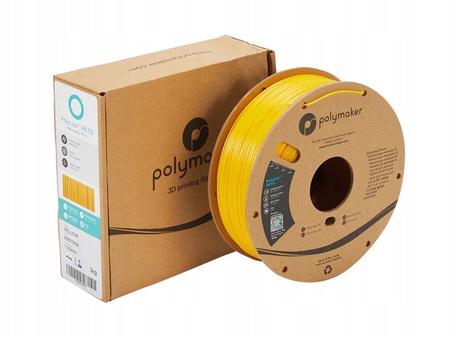 Filament PolyLite PETG firmy Polymaker to materiał o zrównoważonych właściwościach mechanicznych i bardzo różnorodnym zastosowaniu. Cechuje go odporność na uszkodzenia i wysoka wytrzymałość temperaturowa. Na tekturowej szpuli znajduje się 1 kg filamentu w kolorze żółtym, a jego średnica wynosi 1,75 mm.