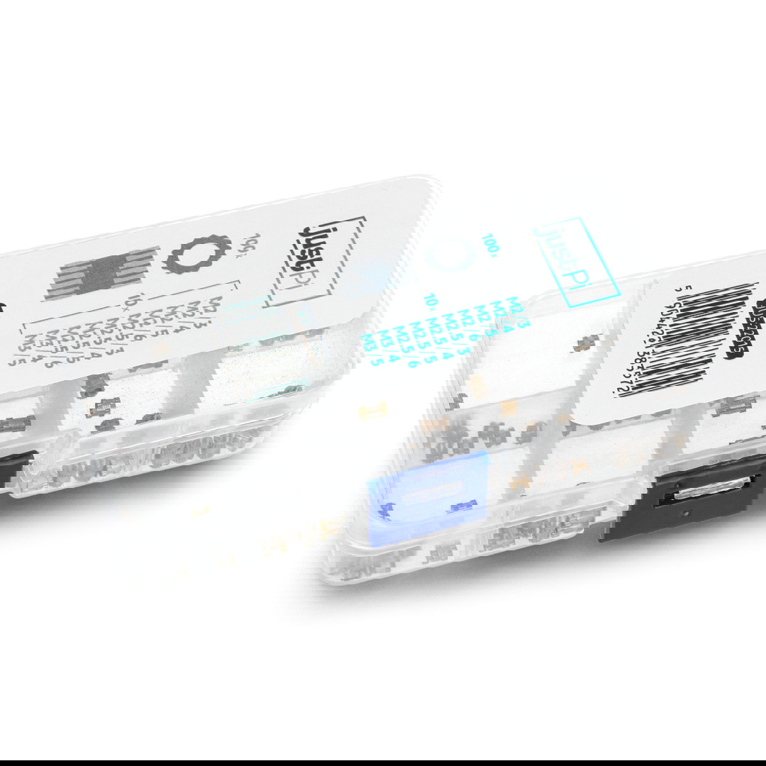 Zestaw 100 mosiężnych gwintów w różnych rozmiarach przeznaczonych do osadzania w gotowych modelach 3D. Rozwiązanie to pozwala m.in. łatwo łączyć ze sobą poszczególne wydruki. Gwinty zostały umieszczone w organizerze ułatwiającym przechowywanie.